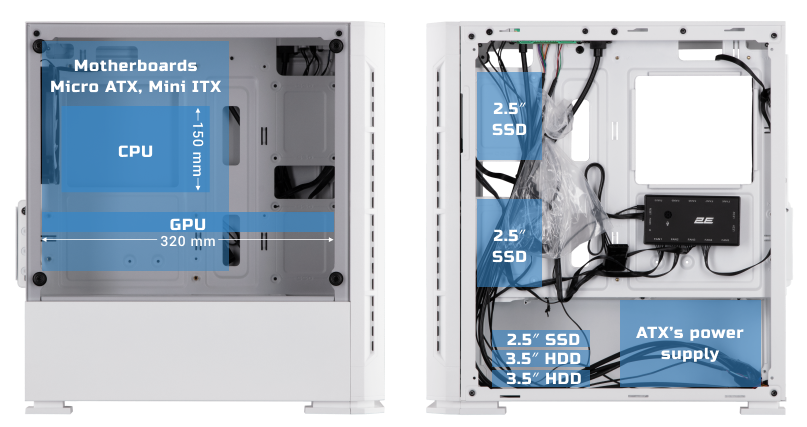Mini Tower form-factor based on 2Е Gaming B7-style chassis. High-quality steel of SPCC standard – 0,5 mm. Tempered glass – 4 mm.