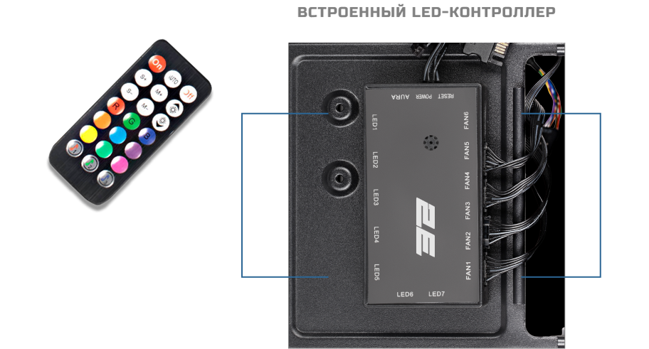 В комплектацию корпуса включен контроллер, который рассчитан на одновременное подключение до десяти ARGB вентиляторов, двух LED-лент, и пульт дистанционного управления. Вы получаете возможность управлять интенсивностью подсветки, скоростью вентиляторов и настраивать различные режимы (дополнительно – функция идентифицирования голосовых эффектов).
